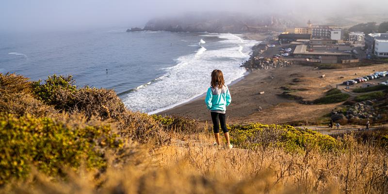 Arya checking out the surf on a cold and foggy morning in Rockaway Beach, CA